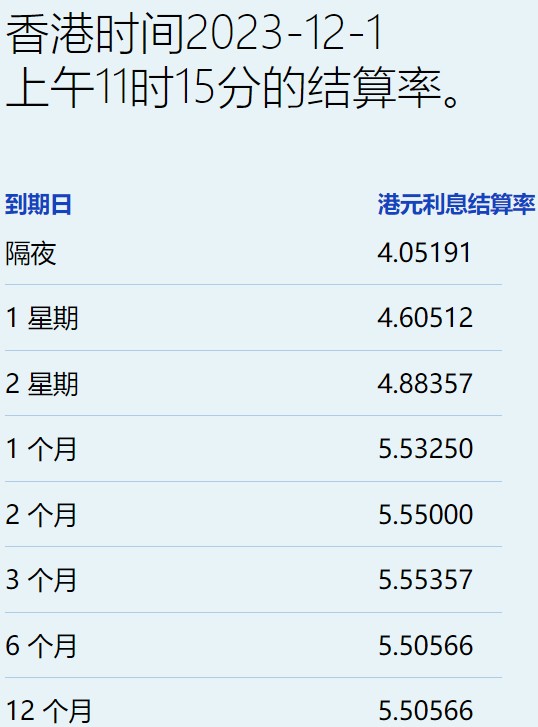 港元拆息在12月首个交易日近乎全线下跌,其中,一、两周拆息齐跌穿5%,但一个月期则回升至5.5325%。隔夜息连跌四天报4.05191%,见近一个半月新低,三个月拆息续降至5.55357%,为11月21日以来最低。六个月及一年期齐降至5.50566%。