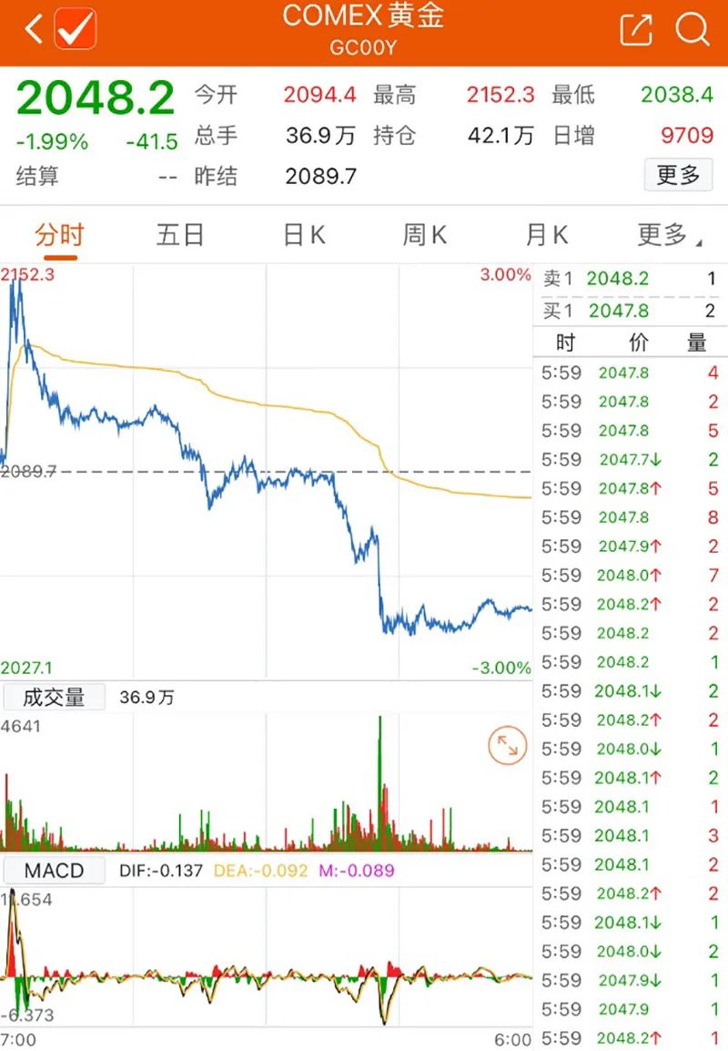 此外,刚刚刷新历史新高的国际金价出现大幅回调,每盎司价格下跌超过100美元,日内跌幅近2%,收报2048.2美元/盎司。