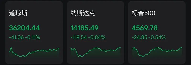 当地时间周一,三大指数小幅收跌。截至收盘,道指跌41.06点,跌幅为0.11%,报36204.44点;标普500指数跌24.85点,跌幅为0.54%,报4569.78点;纳指跌119.54点,跌幅为0.84%,报14185.49点。