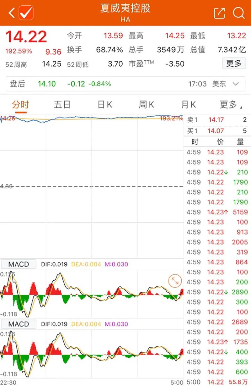 焦点个股方面,将以19亿美元现金加债务的方式被竞争对手阿拉斯加航空收购的美股航空股——夏威夷控股,4日股价暴涨逾190%,盘中最高触及14.25美元/股。