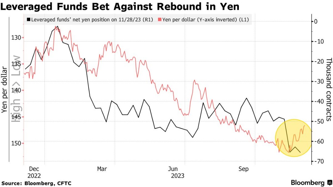 根据美国商品期货交易委员会(CFTC)最新数据,截至11月28日,杠杆基金的净日元空头合约增加了2,833份,达到65,611份。据了解,日元从11月13日的1美元兑151.91日员近期低点,升值了近4%至周一的146.23,为9月中旬以来的最高水平。