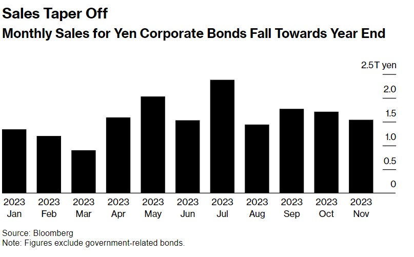 机构汇编的数据显示,截至11月,日本和外国借款人的日元计价公司债券发行规模连续两个月下降。尽管到目前为止,2023年的发行量同比增长了30%,达到创纪录的17.7万亿日元(1210亿美元),借款人在今年可谓争先恐后地在成本进一步上升之前进入市场。