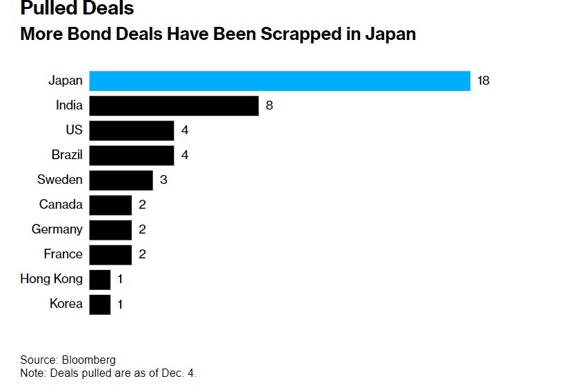 由于日本债券市场出现的波动,今年有大量的债券发行交易被取消。包括日本能源供应商Iwatani Corp. 和社交网络提供商Gree Inc在内,今年至少有18家日本企业的债券发行被推迟或取消。Food & Life Cos表示,由于周一的市场环境,该企业取消了10年期日元企业债券的发售计划,只发售了5年期日元计价的债券。此外,日本债券发行框架下的漫长营销周期使这些问题更加复杂。