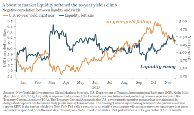 对此,New York Life Investments经济学家兼投资组合策略师Lauren Goodwin表示,她认为对隔夜逆回购的需求下降可能反映出市场的流动性增加,而秋季流动性的增加推动了10年期美债收益率回落。