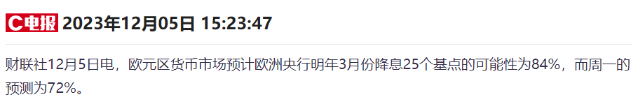 此番言论发表后,货币市场加大了对欧洲央行更快、更大幅度降息的押注,交易员认为2024年3月份前至少降息25个基点,并预计明年年底前至少降息150个基点。与之相比,三周前,第一季度降息的几率几乎为零。