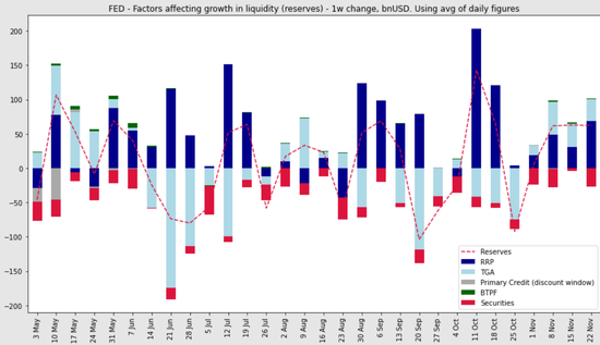 宏观策略师西蒙·怀特(Simon White)也撰文称,上个月,流动性对资产非常有利,美联储储备增加了近2000亿美元。货币市场基金从逆回购工具中提取资金,加上财政部从其在美联储的账户(TGA)中提取资金,导致尽管量化紧缩仍在继续,但储备金仍大幅增加。