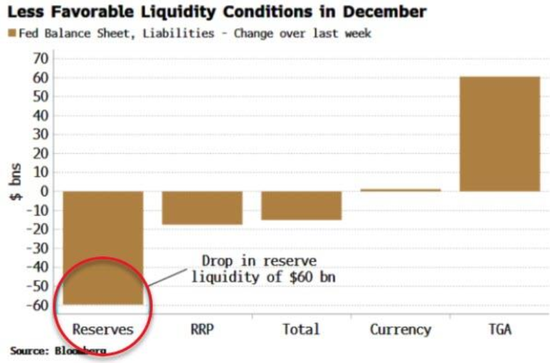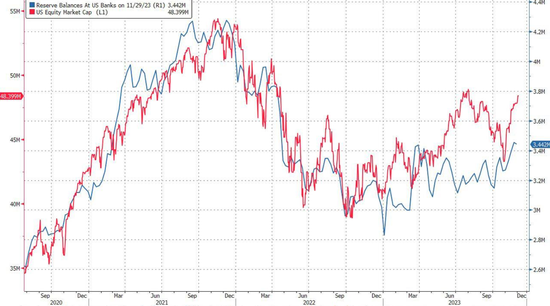 美股走势(红线)vs美国银行的储备金余额(蓝线)