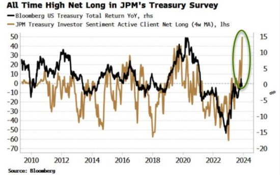 此外,美债仓位的扭曲也值得担忧,如果美债多头仓位像摩根大通调查显示的那样极端做多(净多头创下历史新高),即使本周出台的数据疲弱也可能引发获利了结,从而推高收益率,促使超买的股票被抛售。