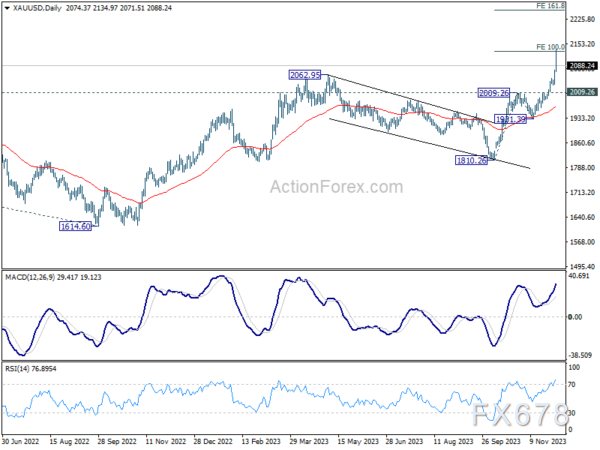 周一(12月5日)早些时候,现货黄金价格飙升至2100美元以上的创纪录高位。消息面上,美联储主席鲍威尔周五表示,目前的利率水平足以完成控制通胀并推动通胀达到2%的目标。由于经济前景不确定性在上升,认为加息周期可能结束的观点增多。对降息可能性的猜测提振了黄金行情。虽然飙升至2144美元的新一轮涨势没有持续,现货黄金价格随后回调至2150美元以下,但黄金后市上行前景仍然很高。
