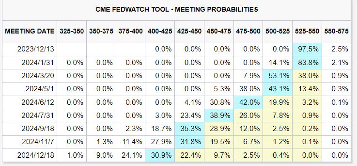 CME“美联储观察工具”显示,利率期货交易员们对于美联储明年降息的预期迅速升温。概率数据显示美联储明年3月份下调基准利率的可能性超过50%,并预计到2024年底,基准利率将降低至4%左右,该基准目前在5.25%至5.5%之间,这意味着市场预期明年降息幅度至少高达125个基点。