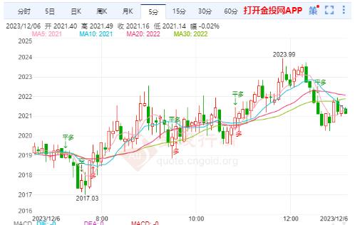 周三(12月6日)本交易日现货黄金日内维持震荡走势,今日开盘报2018.79美元/盎司,最高触及2023.99美元/盎司,最低触及2017.03美元/盎司,截止发稿金价报2022.79美元/盎司,涨幅0.19%。