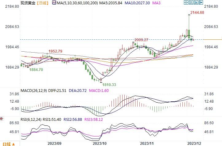 周二(12月5日),由于美元指数上涨隔夜重夺104大关,现货金继续下跌0.5%,险守2010美元关键支撑位,最终收盘在2,019.42美元。