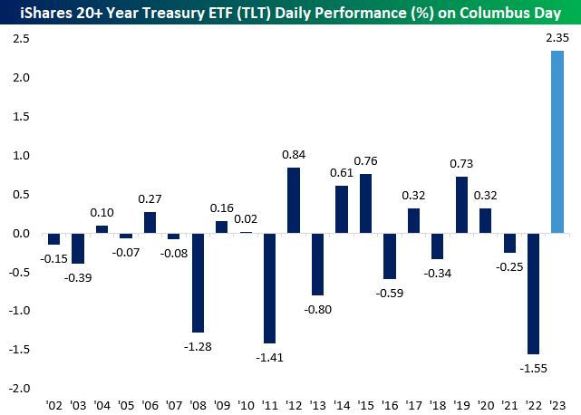 一组统计显示,iShares安硕20年期以上美国国债ETF周一创下了自2002年有纪录以来,在哥伦布日现货市场假期时的最大单日涨幅。