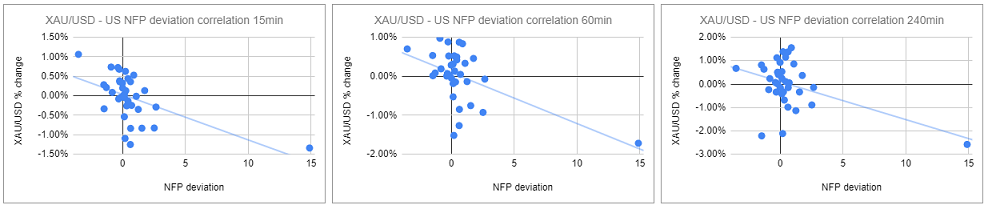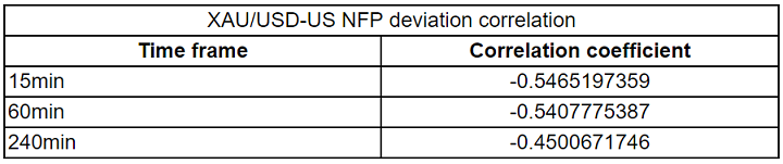 我们绘制了非农数据发布后的15分钟、1小时和4小时内的黄金价格反应。然后,我们将黄金价格的反应与实际非农结果与预期结果之间的偏差进行了比较。