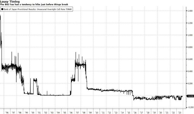 然而历史纪录显示,日本央行加息后不久,往往会遇到倒霉事,甚至是经济危机。日本央行在1990年代长期维持0.5%的低利率,并在90年代末引入零利率,但这未能刺激日本经济从1980年代泡沫破裂后的萎靡中复苏。而到了2000年8月,日本央行重新升息至0.25%,当时看来互联网泡沫的风险仍然可控。但糟糕的是,就在日本央行升息仅两周后,纳斯达克指数开启了超过两年的跌势。