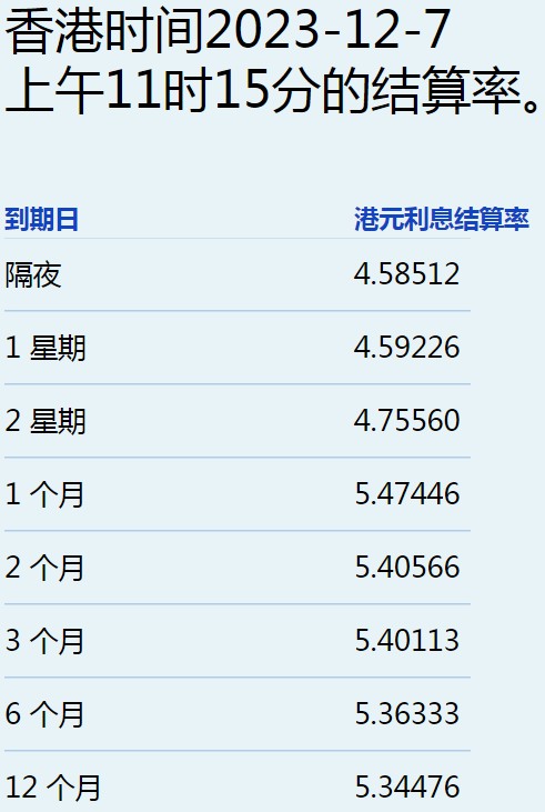 港元拆息连续三日全线下跌后,12月7日全线反弹,隔夜息结束七连跌,急升近97基点报4.58512%,创逾一周新高。与楼按相关的一个月期亦微升至5.47446%。反映银行资金成本的三个月拆息中止六连跌,从近三周低位回升至5.40113%。六个月及一年期分别报5.36333%及5.34476%。