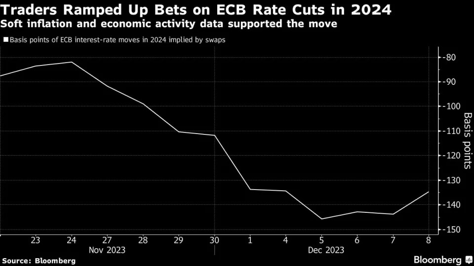 德国公债收益率在过去一个月下跌逾40个基点,因在数据显示通胀和经济活动逊于预期后,投资者大幅加大对欧洲央行明年降息的押注。然而欧洲央行鹰派委员施纳贝尔上周表示,通胀下降“显著”,市场将其视为降息可能早于预期的信号,这进一步推动了欧洲央行的重新定价。