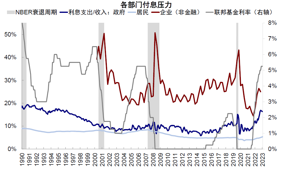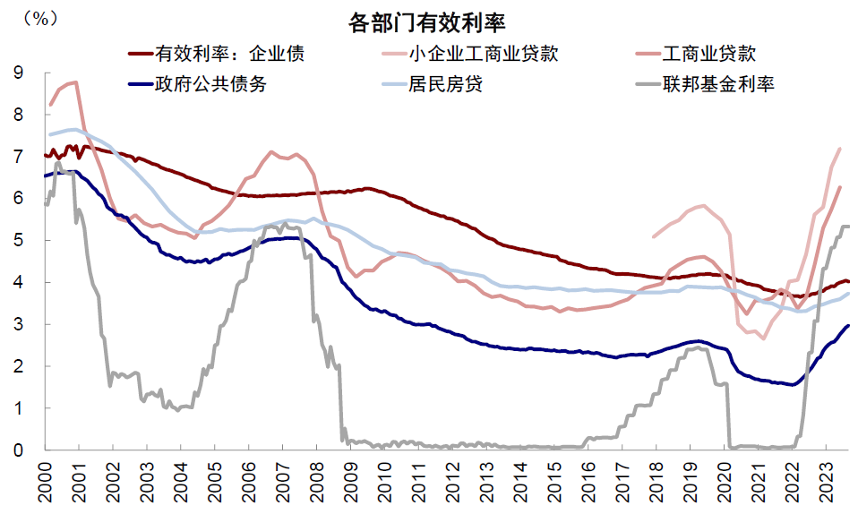 1)高利率对存量需求挤压有限,消费仍具有韧性,基本面突然和深度下滑的可能性较低。由于居民部门94%按揭都是固定利率,因此高利率对居民付息压力的挤压缓慢且有限,我们测算当前付息占收入比例只到2019年水平,实际有效利率3.7%,远低于8%的30年新增按揭利率。再加上较多的超额储蓄可以支撑至2024年下半年,都解释了美国居民消费的韧性。至于信用卡违约率的抬升,其1万亿美元存量只占居民17万亿美元负债的6%,不是主要矛盾。这一局面使得占经济八成的消费维持韧性,美国增长面临深度和突然下滑的可能性较低,也是我们判断美国在三个月内需要降息紧迫性没那么大的基本面“支点”。