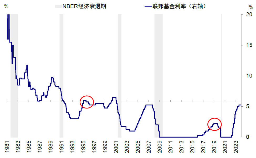 ► 预防式降息:类似于停止加息观察紧缩效果,也可以预防式降息一两次观察效果。考虑到美国通胀水平从9%以上的高位已经回落至3%,且我们测算未来可能继续回落至2%~3%区间,通胀预期下行导致即便美联储停止加息,实际的联邦基金利率也会上升。美联储提早小幅降息有助于防范过度紧缩的风险,但次数可能有限。90年代以来就有两次预防式降息的经验,例如1995年和2019年,经济均未衰退但美联储都分别小幅降息75bp,且距下次降息分别停止了一年和4个月。但站在当前角度,由于融资成本刚刚压制,预防式降息可能冒着较大需求再度上行的风险。