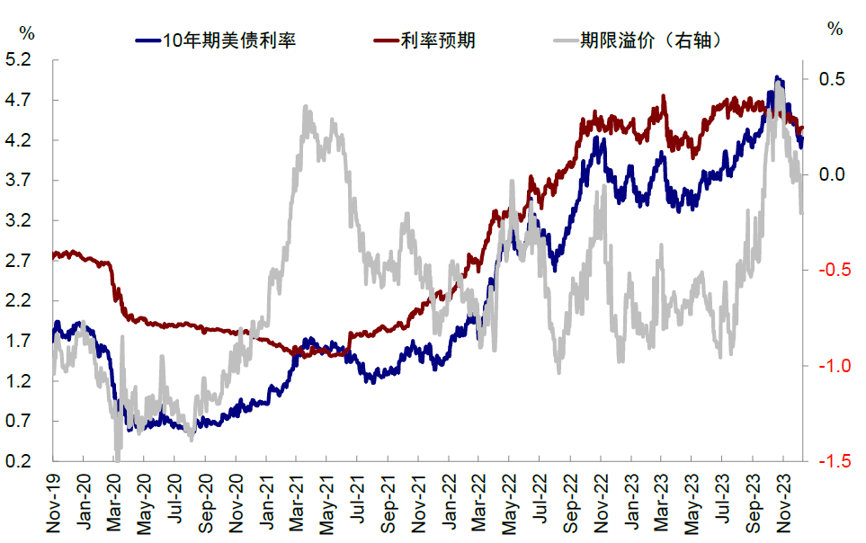 一、美债利率下行的原因:期限溢价与实际利率回落