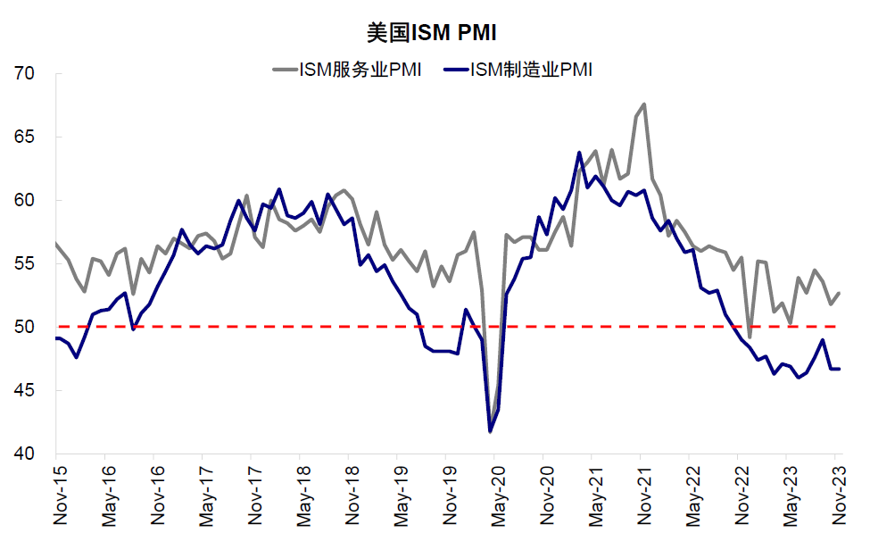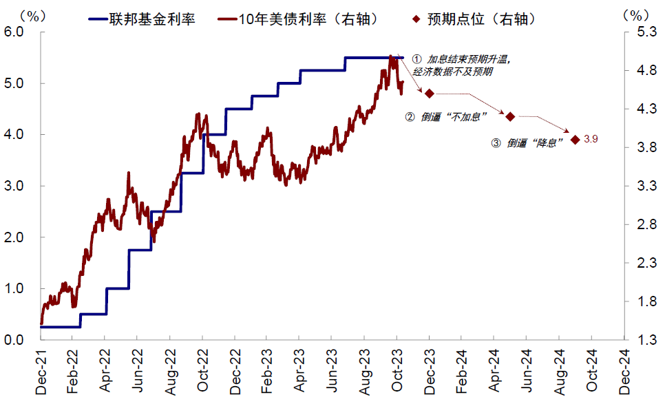 总体而言,基本面并不支持美联储过早降息,当前降息预期和美债利率快速下行已经抢跑,我们提示12月FOMC会议美联储继续敲打的可能性(北京时间12月14日凌晨)。我们判断12月会议大概率不加息,但由于会议会公布经济预测及散点图,所以美联储对2024年利率终点的判断也将成为市场预期“兑现”还是“矫正”的关键。9月FOMC会议美联储对2023年和2024年利率终点判断为5.6%和5.1%(隐含2024年降息2次),相比6月会议和市场会前预期的4次降息更为鹰派,引发市场波动。