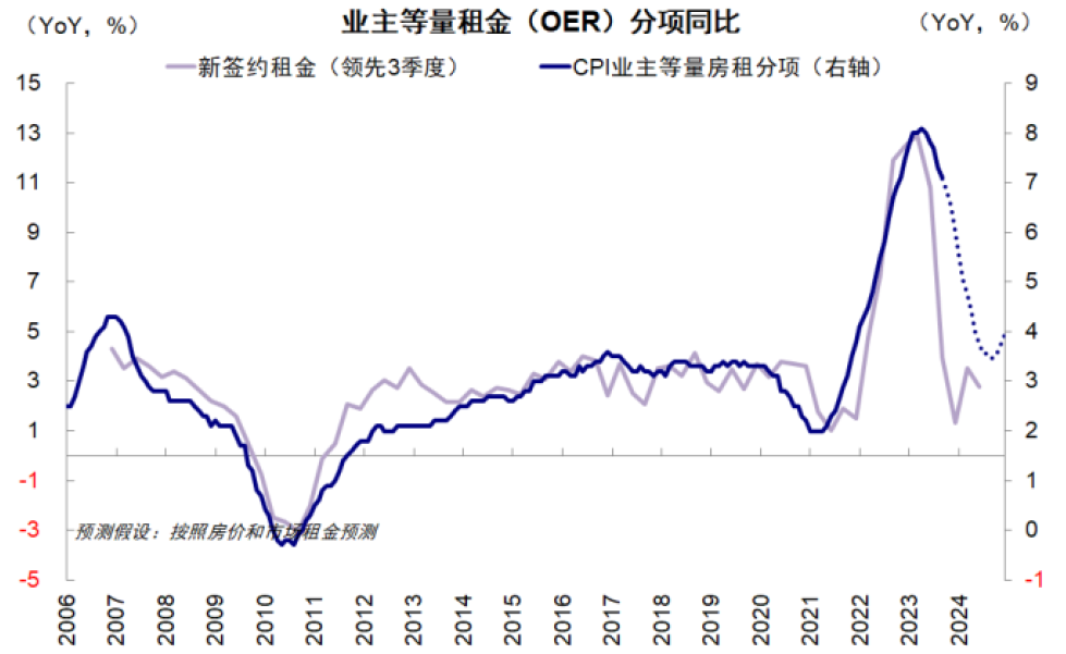 图表12:新签约租金领先CPI中大权重项等量租金(OER)大约三个季度,如果只参考该指标,1Q24租金同比或上行