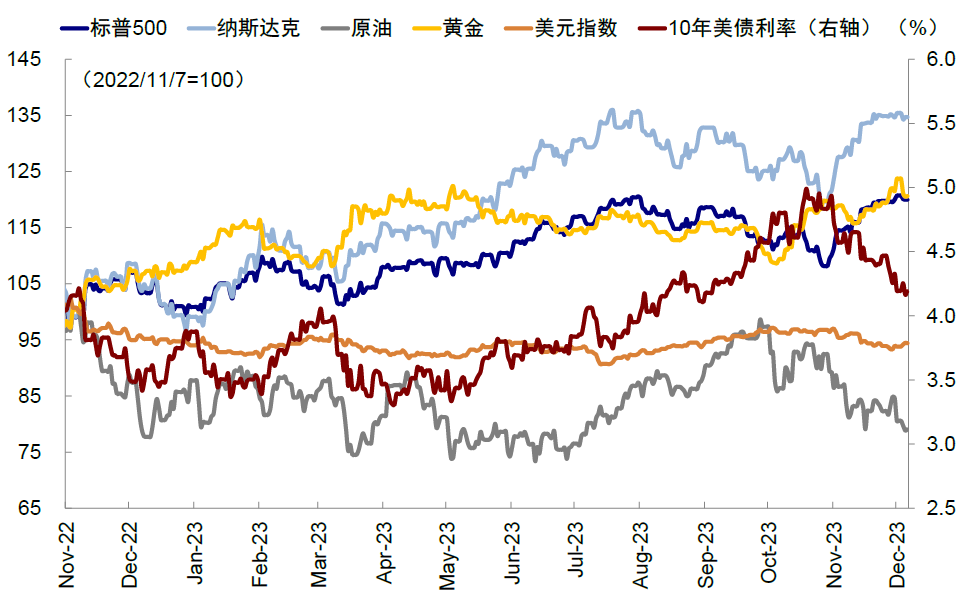 图表1:11月美债利率从10月末的4.9%持续回落至12月初的4.2%以下,驱动纳斯达克、黄金等大涨