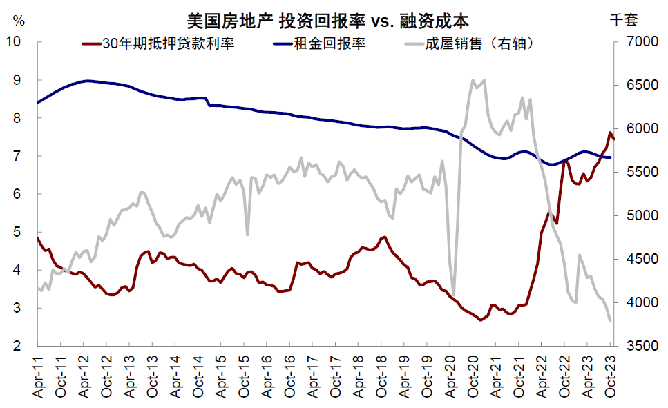 2)利率过早下行可能再度激活增量需求,如地产。对比当前居民和企业部门新增融资成本与投资回报率,可以发现也就刚刚超过,例如7.5%的30年按揭利率刚超过7%的租金回报率。因此,若市场自发交易降息、且美联储也快速降息的话,有可能使得本来需求就不错的房地产市场需求再度活跃,进而达不到美联储希望约束增量地产和投资需求的目的。今年三季度美国地产市场一度活跃就是因此而起,也是美联储主席鲍威尔一直不希望过早放弃对于“加息”表态的原因。