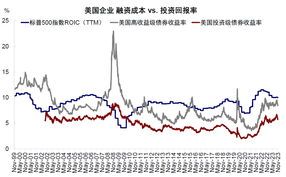 图表10:9%的高收益级债券收益率已经较高,与10%的标普500ROIC已缩窄至不到100bp