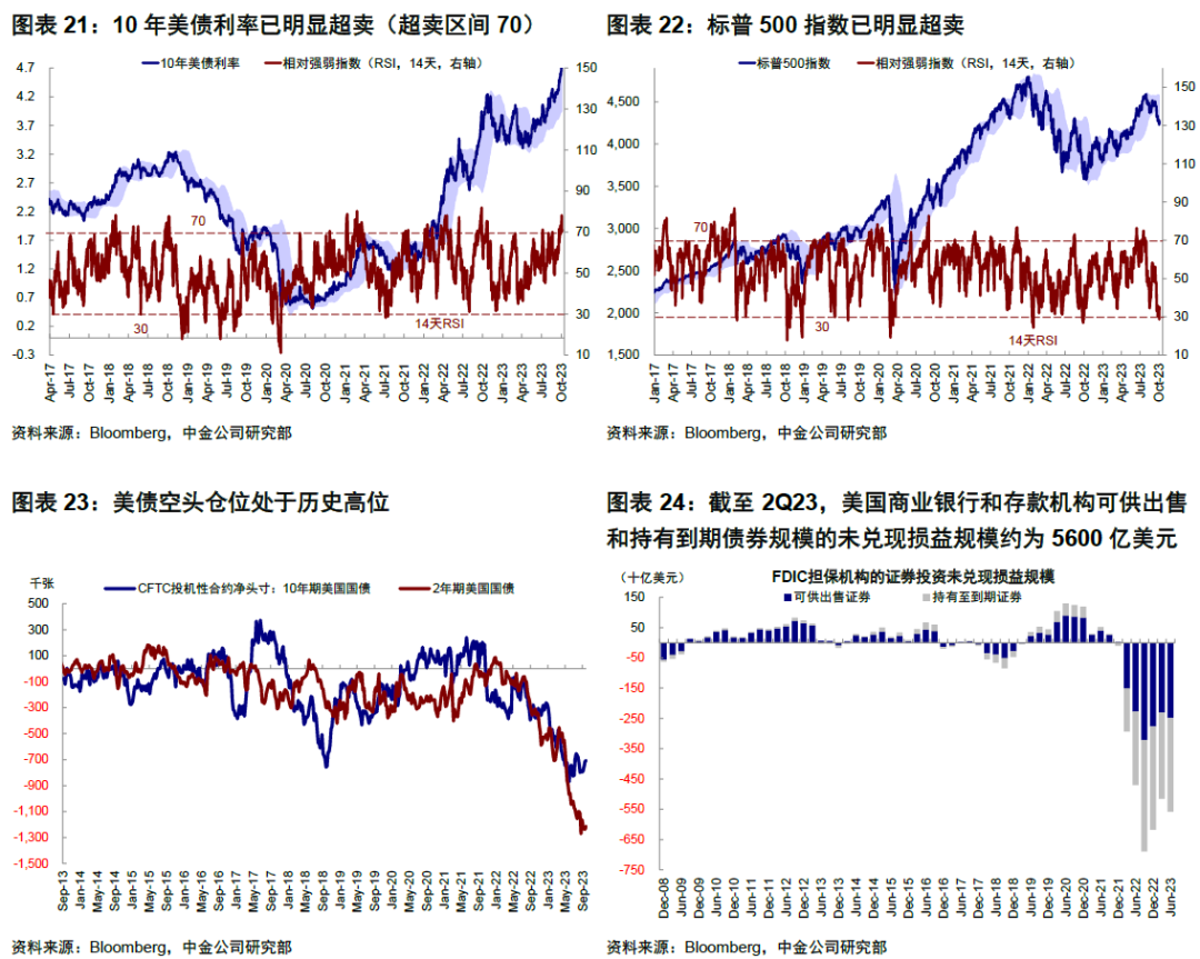 从技术面看,当前美债利率和美股都明显超卖,空头仓位也处于历史高位,但交易上形成了自我加强的预期实现。因此这一环境下,若想停止利率上冲,需要较为大幅低于预期的经济数据形成增长放缓预期、或者风险事件形成的避险情绪来扭转这一负向螺旋;又或者利率快速上冲释放卖压,使其吸引力再度提升。