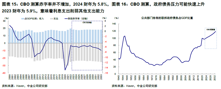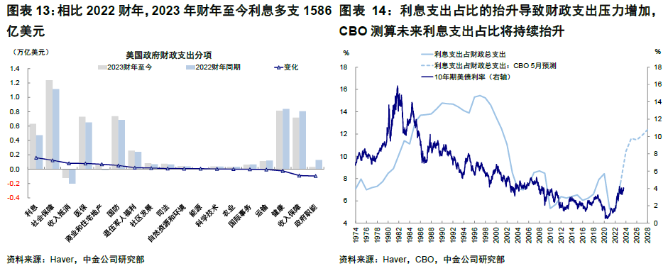 投资者之所以需要更多的风险补偿,一方面是对降息路径延后的不确定性重新定价,另一方面也与美国财政部发债激增导致债券供给增加有关。9月FOMC将2024年利率终点从4.6%上调至5.1%,隐含降息次数由4次减少到2次。与此同时,美国财政部在7月最新公告中将三季度净发债规模抬升至超1万亿美元,四季度净发债规模预计将达8520亿美元。发债规模超预期增加主要受到赤字上升的影响。往后看,利息负担加重成为国债供给的驱动因素之一。相比2022财年,2023年财年至今利息多支1586亿美元。CBO测算未来利息支出占比将持续抬升,与此对应的政府债务率也将继续抬升。相比降息路径延后导致对长端国债利率的一次性重新定价,财政发债供给的增多可能会在未来一段时间持续成为约束期限溢价的压力。
