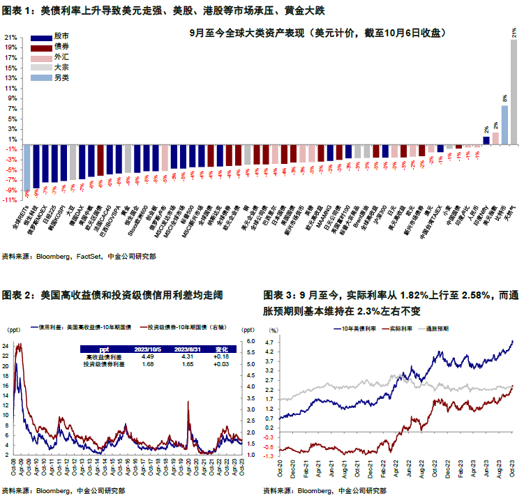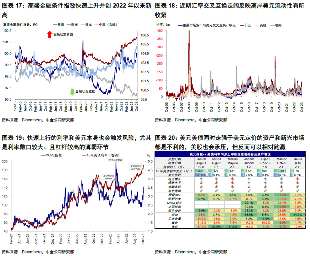 值得注意的是,快速上行的利率和美元本身也会触发风险,尤其是利率敞口较大且杠杆较高的薄弱环节。如此前SVB代表的中小银行、商业地产或高收益债等等。3~5月份的经验告诉我们,上述“灰犀牛”问题未必一定爆发风险、也并非出现风险后就无法兜底。风险的出现往往有一些意外因素触发,但是这些薄弱环节更容易在极端市场环境下成为“黑天鹅”,因此值得密切关注。这也是为什么往往当美元和美债利率快速上冲后,二者或者其中一者都会快速回落的原因。