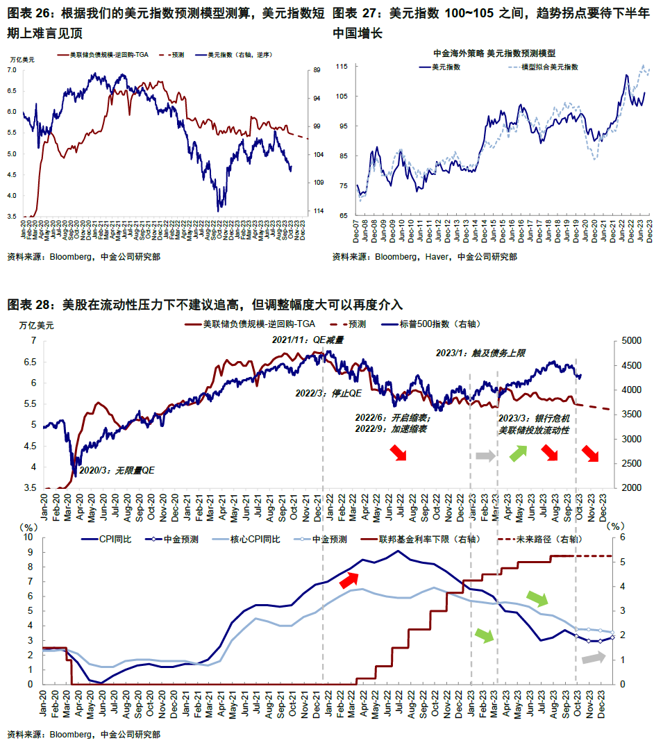 美元和美债利率同步走强一般发生在加息初期,此时不仅利率走高预期较强,且美国增长向好甚至强于其他市场,因此才会导致二者共同走高。然而本轮美元和美债利率的同步走强发生在加息尾声,也说明市场在对美国经济增长和降息路径的判断上需要重新纠正此前预期。正因如此,当美元和美债利率走强时,意味着美国国内和海外美元流动性都在收紧(体现为汇率交叉互换走高和国外官方机构在美联储存托证券规模的减少),这对于美元定价的资产和新兴市场都是不利的。相比之下,虽然美股也会承压,但反而可以相对跑赢。