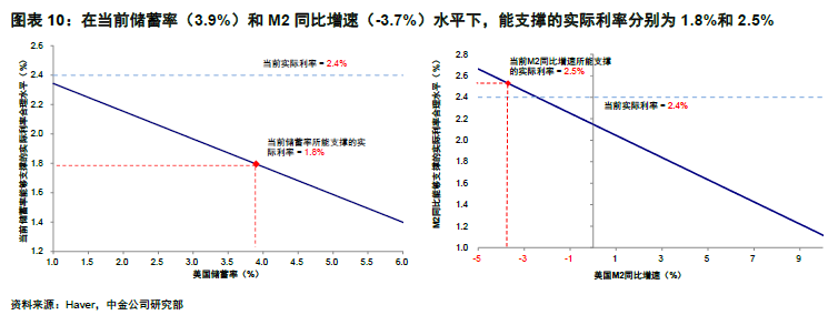 假设10年通胀预期持平于2.3~2.5%(6月至今情况),参照我们在《实际利率持续为负之“谜”》中介绍的方法,在当前储蓄率(3.9%)和M2同比增速(-3.7%)水平下,能支撑的实际利率分别为1.8%和2.5%,那么对应10年美债利率在4.1~5%左右。