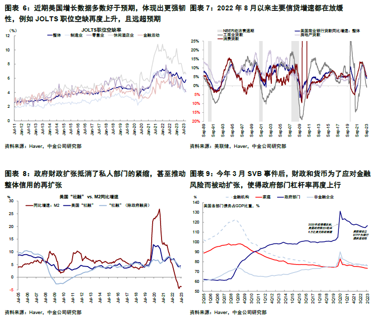对比之下,近期美国经济数据多数好于预期,体现出更强韧性,如JOLTS职位空缺和非农就业远超预期、耐用品订单和ISM制造业PMI超预期抬升等。美国近期数据较好甚至呈现再加速迹象,主要是由于财政作为信用扩张手段对冲了高利率环境下私人信用的收缩。例如,2022年8月以来主要信贷增速都在放缓,银行放贷标准也继续收紧,但今年3月SVB事件后,财政和货币为了应对金融风险而被动扩张,使得政府部门杠杆再度上行,抵消了私人部门的紧缩,甚至推动整体信用的再扩张。