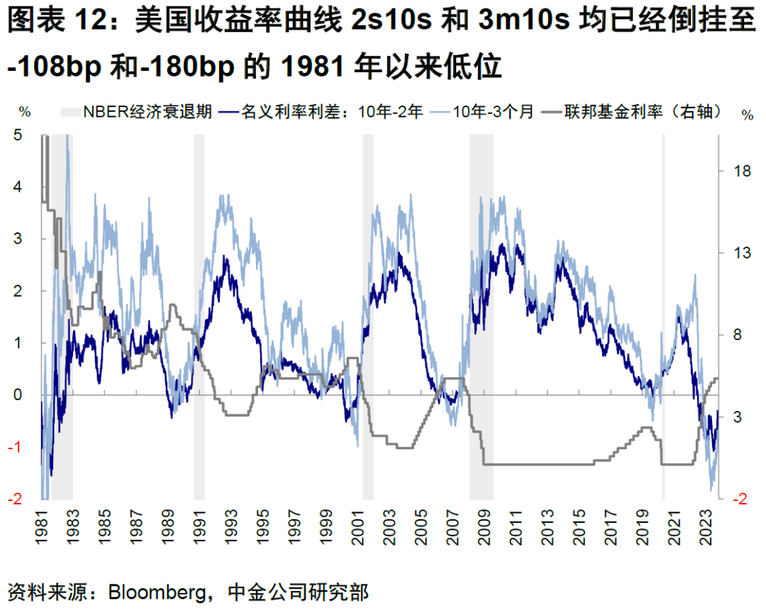 在此轮长端利率快速上行前,美国国债收益率曲线中2s10s和3m10s均已经倒挂至-108bp和-180bp的1981年以来低位。经过近期长端利率快速上行后,上述倒挂程度已经快速收敛至-30bp和-77bp,即所谓收益率曲线“熊陡”。