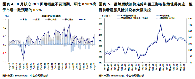 通胀方面,高油价推升8月CPI整体再度走高,同时核心CPI回落不及预期(整体CPI环比由0.2%升至0.6%,能源分项贡献0.4ppt;核心CPI受机票价格和医疗服务等影响,环比0.28%超出市场预期的0.2%)。但油价近期走高更多由供给而非需求因素主导,很难就此认定仅单纯依靠供给因素就持续上行,中金大宗商品组认为90美元/桶以上的布伦特油价已经超过基本面能支撑的水平。近期油价再度回落至8月末水平的84美元/桶、且8月PCE也低于预期(PCE环比0.4% vs. 预期0.5%;核心PCE环比0.1% vs. 预期0.2%)也一定程度显示油价对于通胀更多为暂时性的“噪音”,而非趋势性的逆转。虽然后续油价走势和罢工影响依然值得关注,但目前看通胀风险并没有大幅失控。至少从结果上来看,通胀并非本轮利率走高的主要原因。