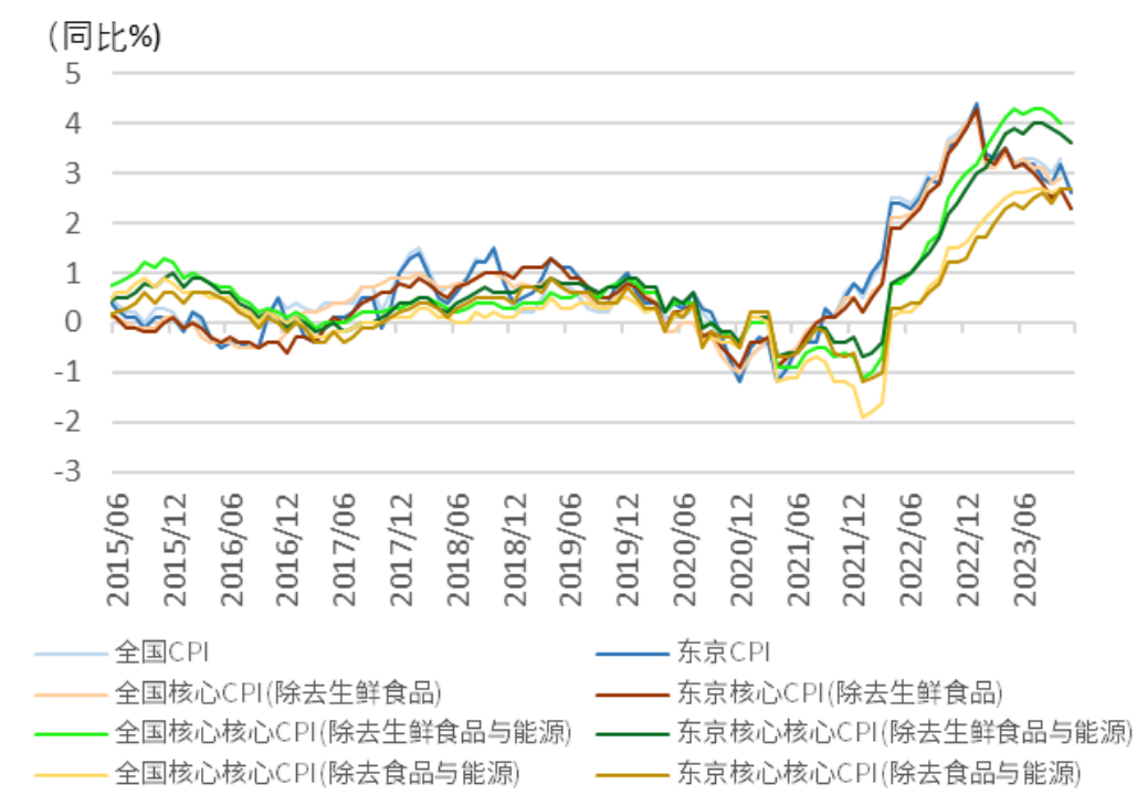 日本通胀见顶迹象逐步明确 上周日本公布了11月东京地区CPI数据,综合CPI同比增长2.6%(预期3.0%、前值3.2%)、核心CPI(除去生鲜食品)同比增长2.3%(预期2.4%、前值2.7%)、核心核心CPI(除去生鲜食品与能源)同比增长3.6%(预期3.7%、前值3.8%)。东京地区通胀同比下降的主要原因来自于食品、电气瓦斯的同比减少,但核心部分的通胀压力基本与去年持平(图表16)。往明年上半年看我们认为日本的通胀或仍在2.5-3.0%左右,日本央行仍然存在连续加息的可能性。