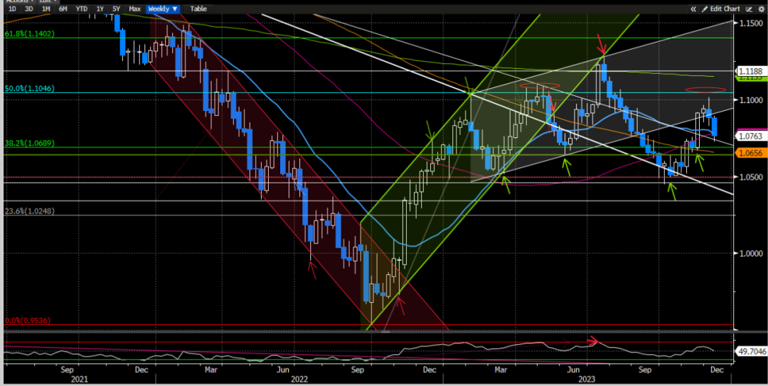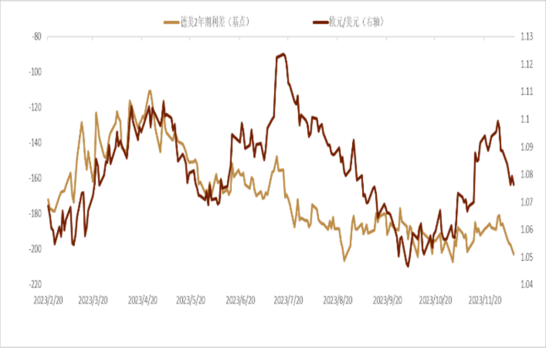 一路走低在上周美国经济数据整体走强的影响下美元出现明显走高,ISM和非农就业数据的整体走强使得市场对美联储明年降息的预期有所回落,而欧元区上周公布的经济数据(PMI等)并未出现显著好转,加之部分欧央行票委的鸽派言论带动市场对ECB明年降息预期的走高,德美利差因此在上周有所走阔进而带动欧元/美元明显下行。往前看,我们认为欧元/美元的走势或继续受欧美经济的相对表现、欧美央行加息预期的变动以及市场整体风险偏好等多重因素的综合影响。
