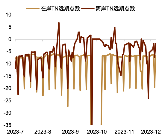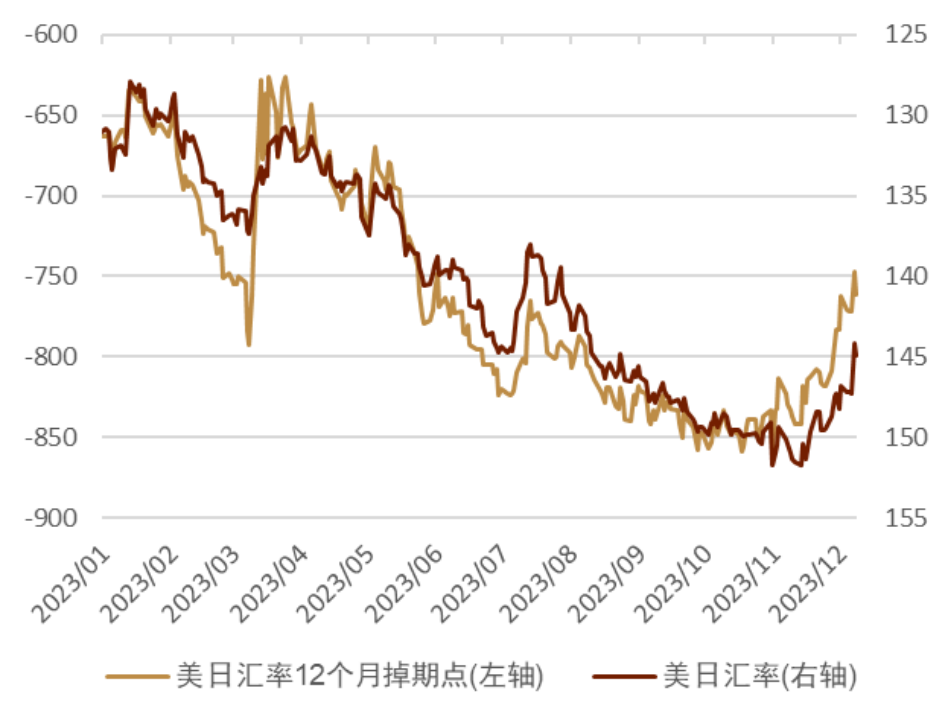 强美元、更强日元上周美元指数时隔3周再度走强,而日元却强于美元成为了上周最强的G10与亚洲货币。上周一至周三,美日汇率一直在147附近做窄幅波动,但进入周四后受到日本央行或退出负利率的影响后,当天日元发生明显贬值,由147迅速下降至143附近,此后进入周五后受到强劲的非农统计的影响,美日汇率有所回调,最终收盘于145附近。上周日元的升值更多是自身行情,但日元的快速走强同时也一定程度拉低了美元指数(图表13),美债利率方面虽然单周来看关联性不高(图表14),但近期由于市场对明年美国的降息预期有所加强,美日汇率掉期点明显收窄,提供了日元升值的压力(图表15)。