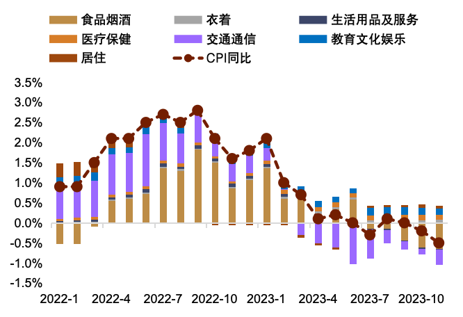 ► 物价数据继续偏弱。11月CPI同比变动-0.5%,弱于彭博一致预期和前值的-0.2%,PPI同比变动-3%,弱于彭博一致预期的-2.8%和前值的-2.6%。CPI方面,食品烟酒或是最大拖累项,交通通信和生活用品及服务同样对物价形成向下压力。主要原因一方面或是农产品,尤其是猪肉价格同比的大幅回落。另一方面则是油价回落叠加假期出行需求减少。根据Macrobond的计算,食品烟酒、交通通信和生活用品及服务分别对CPI同比拖累了0.638、0.37和0.03个百分点(图表5)。PPI方面,国家统计局认为[1]国际油价回落和部分工业品市场需求偏弱等因素则是PPI环比和同比变动不及预期的主因。往后看,我们认为由于内需修复尚未看到显著进展,物价环比的恢复或有待更多需求侧政策的落地见效。
