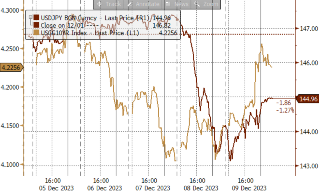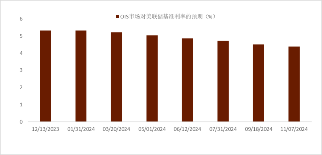 而此后公布的12月密歇根大学消费者信心指数回升幅度大超市场预期(69.4 vs市场预期62),而且消费者对未来一年的通胀预期自11月的4.5%意外降至2021年3月以来最低的3.1%。总体看,美国经济似乎依旧保有韧性,而这也使得美债利率和美元也在数据公布后明显走高(两年期美债收益率升至月内高点4.72%附近)。在此背景下,目前OIS市场预期美联储本轮加息周期已经结束,而且对明年的降息预期有所回落(OIS市场预计明年美联储降息的总量由上周初的120基点降至90基点)。