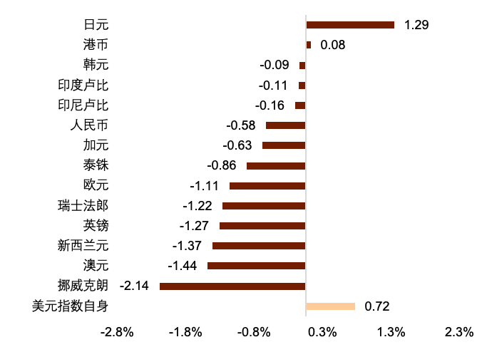 美元在主要央行会议周之前明显反弹,这也是美元指数最近4周以来的首次收涨。强于预期的就业数据扰动了10月以来美国主要经济数据偏弱的态势,我们认为这或让美联储在下周会议上有了更多理由压制市场的降息预期。而欧洲偏弱的经济数据和欧央行官员的鸽派发言则带动了更多对于欧央行更早更多降息的交易。这些都成为了美元短期反弹的基础。分品种看,除了日元外,G10货币对美元上周都有所回调。日元作为唯一例外,在加息预期有所提前的支撑之下收涨1.29%,我们认为日元这轮贬值周期的大底很可能已经确认。原油价格上周延续了10月以来的走低趋势,在此影响之下挪威克朗上周收跌2.1%领跌G10货币;RBA上周虽符合市场预期按兵不动,但会议声明中较为鸽派的基调使得澳元最终收跌1.44%;加拿大央行上周连续第三次维持利率不变,虽然承认经济陷入停滞,但保留进一步加息的可能,加元受此支撑上周仅仅小幅收跌0.63%;而欧央行鹰派票委的鸽派发言使得市场对欧央行明年降息的预期有所走高欧元上周最终收跌1.11%。