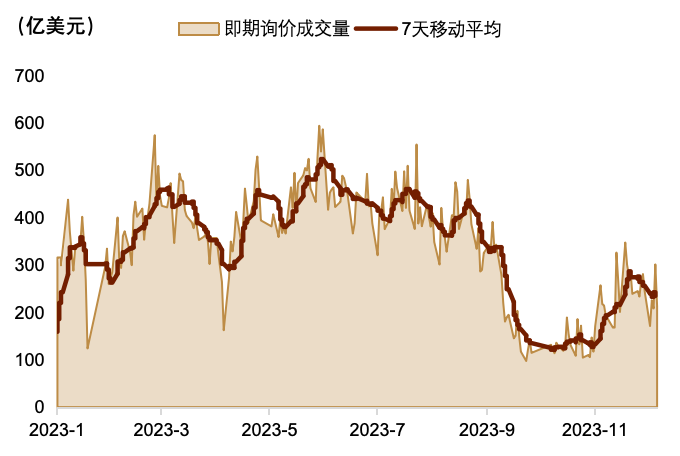 稳汇率政策继续发力 上周中间价调控继续在稳定外汇市场预期等方面发挥重要作用。尽管上周人民币汇率面临波动,中间价继续维持在7.10-7.12的区间内窄幅波动(图表6)。对外汇市场的预期稳定起到积极作用。此外,我们亦能看到上周逆周期因子的调整幅度处于低位。但人民币离岸流动性重新开始小幅收紧(图表7),即期询价成交量的小幅回落(图表8),这表示在美元偏强的时点,稳汇率政策又开始发力。美国就业韧性显示美联储后续的宽松并非一路坦途,美债收益率与美元指数阶段性反弹的可能性不容忽视。这也意味着在国内经济有待呵护的背景下,人民币汇率的预期稳定依旧需要稳汇率政策的继续发力。