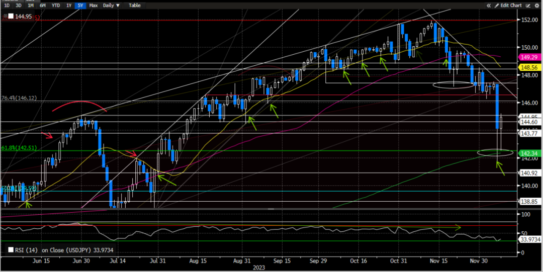 美元/日元上周如期一路走低并且跌至我们在12月外汇月报中给出的第一目标位142.50附近后有所反弹(详见[6]《年内,美元指数仍有下行可能》技术分析部分),考虑到美元多头上周五在200天均线142.50附近找到支撑(图表20中绿色线)并且RSI指数自超卖区域初现反弹迹象,我们认为美元本周可能进一步走高,上周周内低点147.50附近可能是近期关键阻力所在,而鉴于21天均线已经自上而下穿过了55天均线,我们认为美元/日元可能会走出冲高回落的行情。