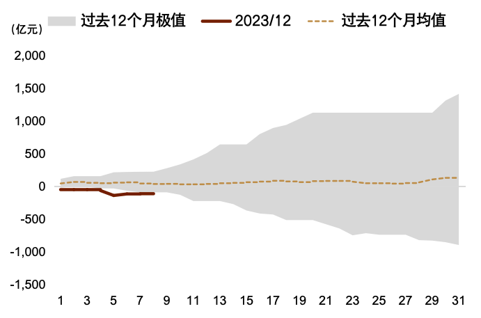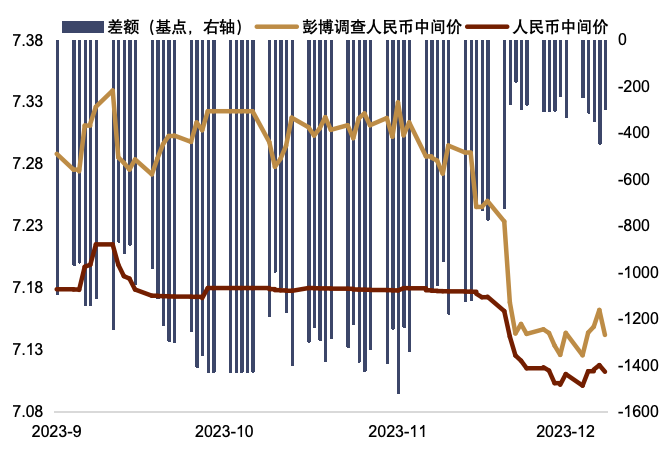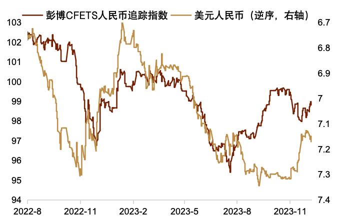 人民币汇率小幅回落上周市场对美联储的宽松预期小幅退坡,美元指数反弹,人民币汇率在季节性因素支撑下跌幅较小,在主要货币中表现靠前(图表1)。上周市场对于美联储后续的宽松预期有所修正,配合11月就业数据超出预期,美元指数反弹走强,并对非美货币形成压制。上周国内公布了进出口及物价数据,内需依旧偏弱,国内经济延续弱复苏。稳汇率政策配合结汇需求释放,CFETS人民币指数继续走高(图表2)。跨境资金方面,截至8日,北向资金累计流出约107.8亿元,流出幅度创2022年10月来新高,或对人民币汇率有一定拖累(图表3)。