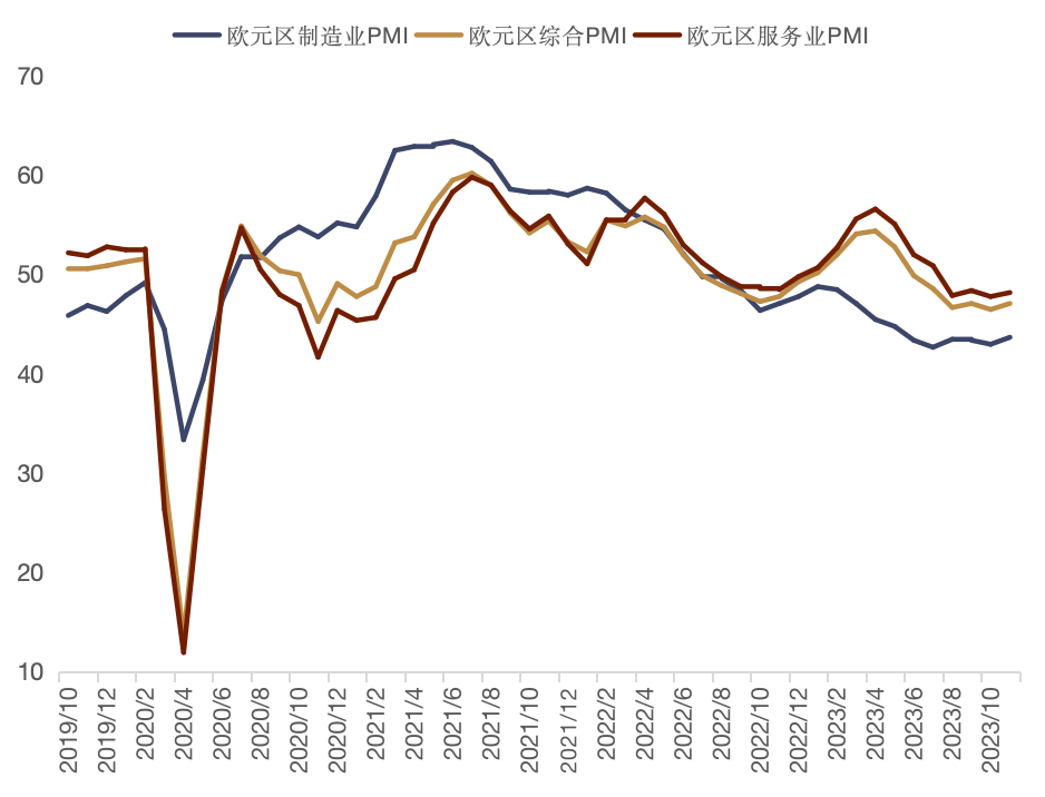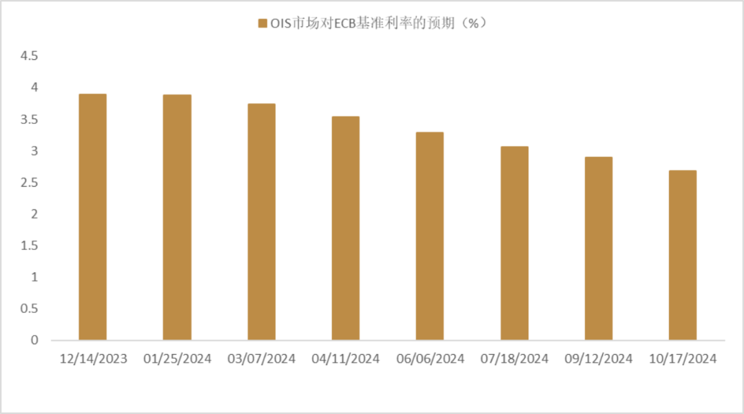 欧元区经济数据边际回暖但整体依旧低迷 欧央行票委鸽派言论带动降息预期走高上周公布的欧元区11月PMI终值较前值有所改善,但整体依旧徘徊于枯荣线下方。制造业PMI自初值的43.8小幅回升至44.2,但依旧处于自2022年7月以来持续的萎缩区间。服务业PMI终值同样从初值的48.2小幅回升至48.7。综合PMI终值录得47.6,好于初值的47.1,但这依旧是连续第6个月低于荣枯线(图表10)此外,德国10月工业产出同比增速录得-3.5%,不及市场预期的-3%以及前值的-3.7%。10月工厂订单同比增速录得-7.3%,同样不及市场预期的-3.9%和前值的-4.3%。而与此同时,欧央行传统鹰派票委schnabel上周明确表示[3],“欧元区通胀的下降是显著的,令人鼓舞的,基准利率不太可能再次上调”。在此背景下,市场对ECB明年的利率路径出现明显下移,OIS市场预计明年11月前ECB降息总量达120基点,并且已经完全计价了明年4月之前的首次降息(图表11)。