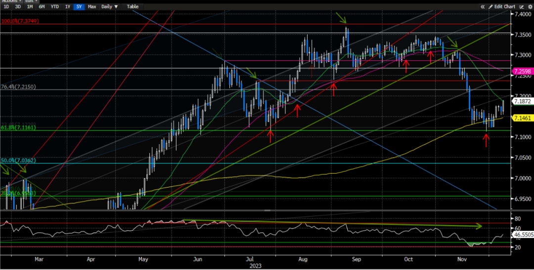 美元/人民币上周如期在61.8%斐波那契回撤位找到支撑后一路走高至21天均线附近(图表17中绿色线)而日线级别上RSI指数也如期自2周前年内最为超卖的水平出现反弹。向前看,我们认为只要美元多头可以成功守住200天均线7.14附近支撑(图表17中黄色线)那么本周美元可能会继续有所走高,尤其如果美元多头可以继续突破21天均线这一近期阻力。上方美元多头的下一个阻力可能位于50天均线7.25附近。如果美元多头不能成功向上突破,那么200天均线以及61.8%斐波那契回撤位7.11附近将提供关键的支撑。