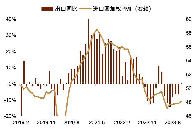 ►进出口数据表现分化。11月出口同比(以美元计价)增长0.5%,高于彭博一致预期的0%和前值的-6.4%。进口同比-0.6%,弱于彭博一致预期的3.9%和前值的3%。进出口数据表现有所分化,外需改善而内需偏弱。我们将东盟、欧盟、美国和日本等主要进口国的制造业PMI和其占中国出口份额做加权平均,计算出进口国加权PMI。可以发现进口国加权PMI在11月进一步恢复(图表4)。具体来看,在对主要贸易伙伴中,仅有欧盟的出口同比出现回落。对美国出口增速则从10月的-8.19%大幅走高至7.35%,对出口同比增幅贡献了较多增量。往后看,主要进口国的PMI或仍维持较强,且12月低基数因素继续存在。我们认为出口同比读数或将在12月继续为正。