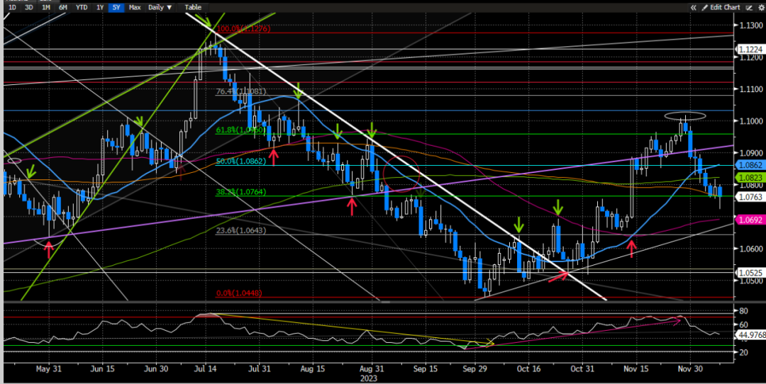 关注欧元/美元55天均线附近的支撑 欧元上周一路走低在1.10附近遇阻后开始逆转10月以来的反弹行情,短期内只要欧元多头未能突破200天均线1.08附近阻力,这或许意味着欧元依旧面临下行风险,55天均线1.07附近可能是下一个支撑。